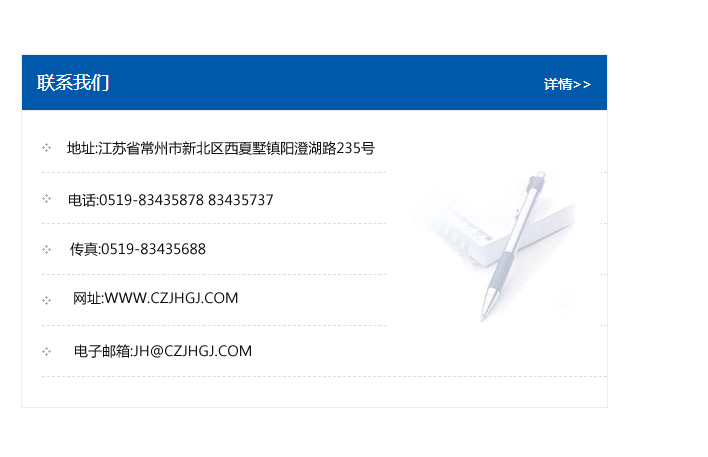 地址:常州市新北區友邦商務大廈1幢16、17層  電話:0519-85101652  傳真:0519-85112595  郵編:213022  網址:www.cz-jiayue_cn.cytm99.com  郵箱:xiajifengaa@163.com